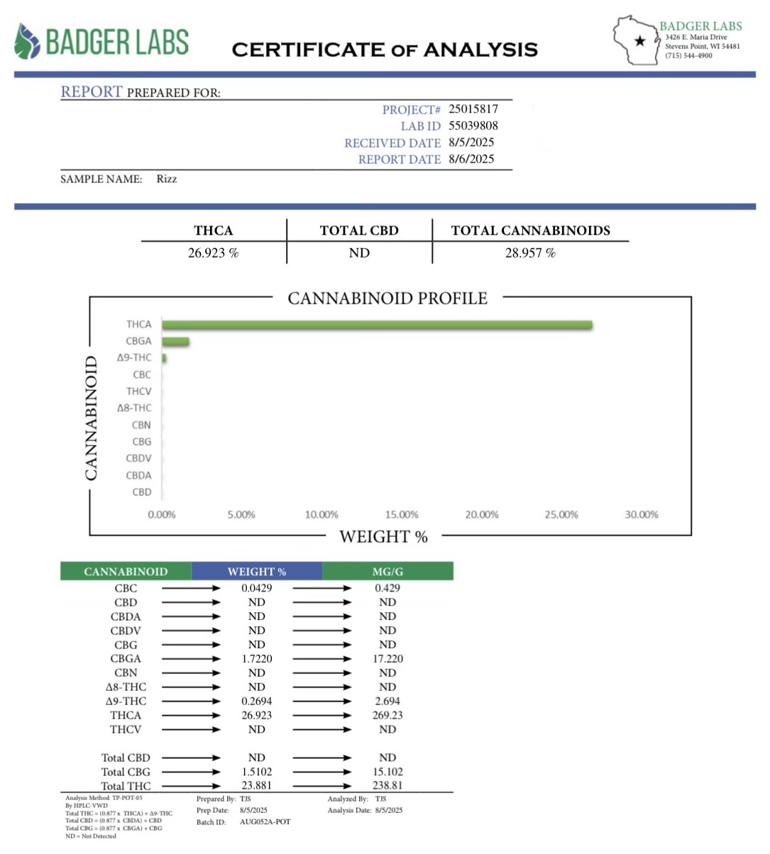 Certificate of AnalysisIngredients: Organic evaporated cane juice, organic corn syrup, organic white grape juice concentrate, pectin sodium citrate, citric acid, ascorbic acid, natural flavors, colors added (including annatto, turmeric, grape juice concentrate, red fruit juice concentrate), cannabinoid distillate.